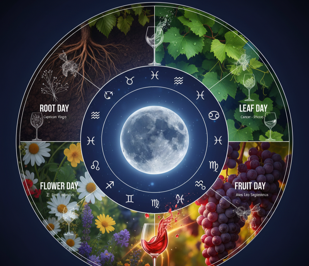 A cosmic farming calendar that divides days into four types (Root, Leaf, Flower, and Fruit) based on the moon's position relative to the zodiac constellations. Different vineyard tasks are timed to different days: harvesting on a Fruit day, for instance, when fire-sign energy is believed to bring out the most vibrant expression of the grape.